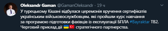 "В турецком Кишане состоялась церемония вручения сертификатов украинским военнослужащим, которые прошли курс обучения по программе подготовки специалистов по эксплуатации БПЛА Bayraktar TB2. Очередной пример действия украинско-турецкого стратегического партнерства", - сообщил он.