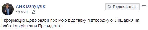 Подтвердил информацию о своей оставке и сам Данилюк. "Информацию относительно заявления о моей отставке подтверждаю. Остаюсь на работе решению президента", - заявил секретарь СНБО в Facebook.