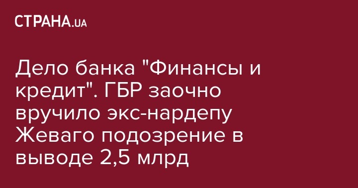 Госбюро расследований заочно вручило подозрение экс-нардепу Константину Жеваго, которого ранее проверяли на предмет причастности к схеме с растратой и легализацией 2,5 миллиардов гривен банка "Финансы и Кредит". Об этом на своей странице в соцсети сообщила первый заместитель председателя ГБР Ольга Варченко.
