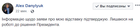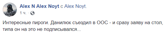 "Интересные пироги. Данилюк съездил в ООС - и сразу заяву на стол, типа он на это не подписывался...", - пишет Алекс Нойт.