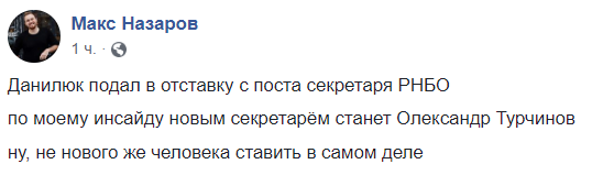 "Данилюк подал в отставку с поста секретаря РНБО. По моему инсайду новым секретарём станет Олександр Турчинов. Ну, не нового же человека ставить в самом деле".