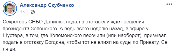 "Секретарь СНБО Данилюк подал в отставку и ждёт решения президента Зеленского. А ведь всего неделю назад, в эфире у Шустера, в том, где Коломойского песочили (или наоборот), призывал подать в отставку Богдана, чтобы тот не влиял на суды по Привату. Се ля ви", - пишет блогер Александр Скубченко.