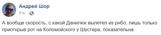 "Скорость, с какой Данилюк вылетел из рнбо, лишь только приоткрыв рот на Коломойского у Шустера, показательна", - пишет блогер Андрей Шор.