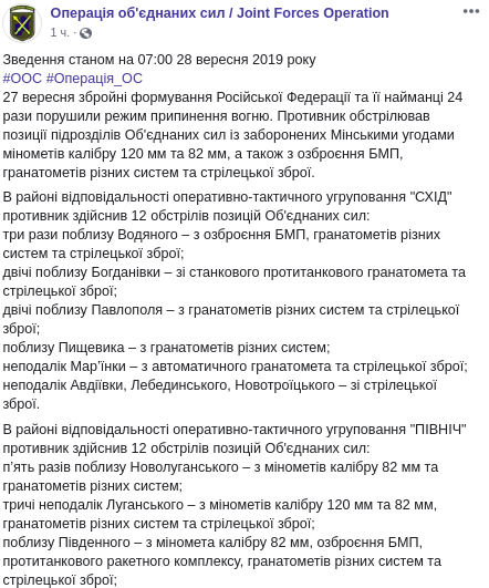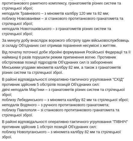 "С начала текущих суток вооруженные формирования Российской Федерации и ее наемники 6 раз нарушили режим прекращения огня. Противник обстреливал позиции подразделений Объединенных сил из запрещенных минского соглашениями минометов калибра 82 мм, а также из гранатометов различных систем и стрелкового оружия".