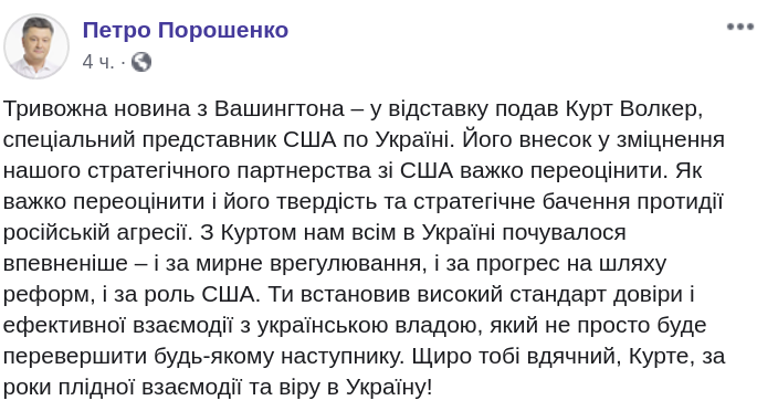 "Тревожная новость из Вашингтона - в отставку подал Курт Волкер, специальный представитель США по Украине. Его вклад в укрепление нашего стратегического партнерства с США трудно переоценить. Как трудно переоценить и его твердость и стратегическое видение противодействия российской агрессии", - написал Порошенко.