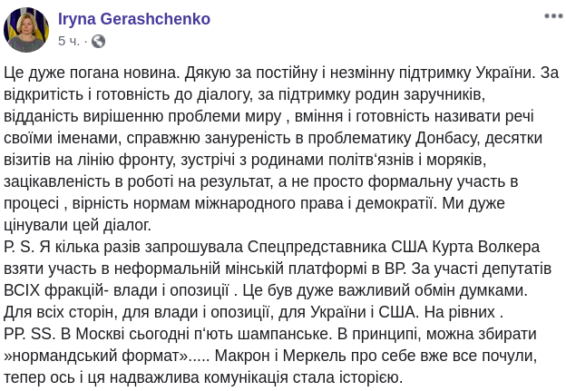 Сопредседатель фракции "Европейская солидарность" Ирина Геращенко (ранее - представитель Украины в гуманитарной подгруппе Трехсторонней контактной группы) также назвала новость о намерении Волкера уйти в отставку "очень плохой". Она поблагодарила его за поддержку Украины, диалог и готовность помочь.