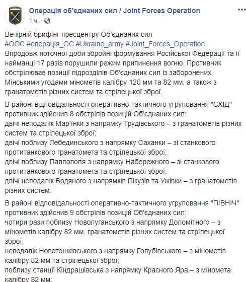 "Противник обстреливал позиции подразделений Объединенных сил из запрещенных минскими соглашениями минометов калибра 120 мм и 82 мм, а также из гранатометов различных систем и стрелкового оружия", - сказано в сообщении.