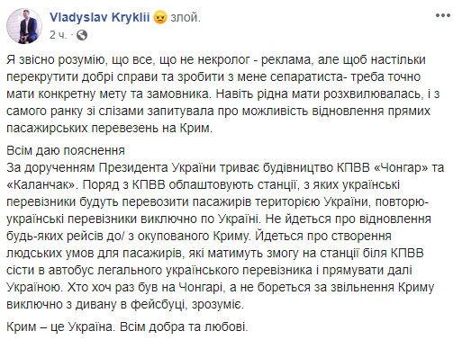 "Всем даю объяснения. По поручению президента Украины завершается строительство КПВВ "Чонгар" и "Каланчак". Рядом с КПВВ обустраивают станции, из которых украинские перевозчики будут перевозить пассажиров по территории Украины, повторю - украинские перевозчики исключительно по Украине", - написал чиновник.
