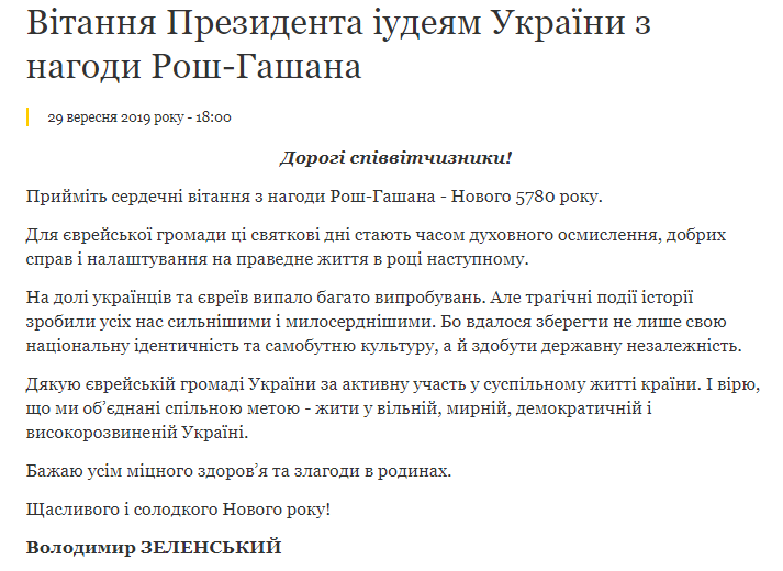 Президент Зеленский поздравил иудеев Украины с новым 5780 годом