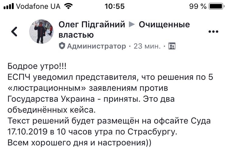 Об этом в Facebook сообщил один из идеологов тмассового обжалования положений "люстрации по-киевски" в ЕСПЧ, экс-прокурор Олег Подгайный.