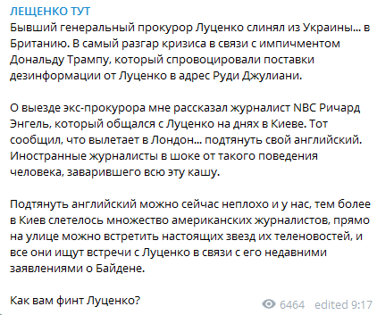Лещенко узнал об этом от журналиста NBC Ричарда Энгеля, который общался с бывшим генпрокурором на днях в Киеве. Тот сообщил, что вылетает в Лондон, чтобы "подтянуть свой английский".