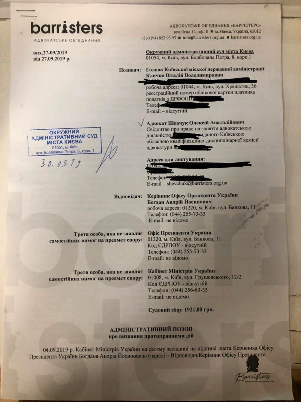 Первый иск Кличко адресован Кабинету министров и премьер-министру Алексею Гончаруку он касается незаконности, по мнению мэра Киева, их решений.