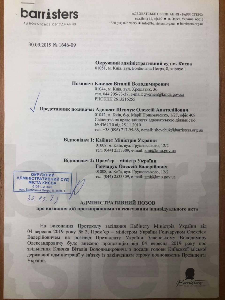"Учитывая приведенные выше положения о том, что ни одно лицо, кроме Киевского городского главы, не может быть назначено главой Киевской городской государственной администрации, полномочия Кличко Виталия Владимировича как законно назначенного главы КГГА также не могут быть прекращены раньше 16 ноября 2020 года", - сказано в первом иске Кличко.
