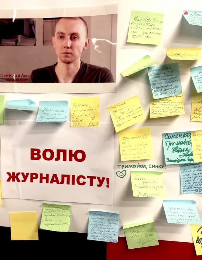 "Накануне его тридцатой годовщины со дня рождения эта наша акция - определенная солидарность. Показать, что мы помним о Станиславе Асееве, мы хотим поздравить его на свободе, пожать руку", - добавил глава НСЖУ.