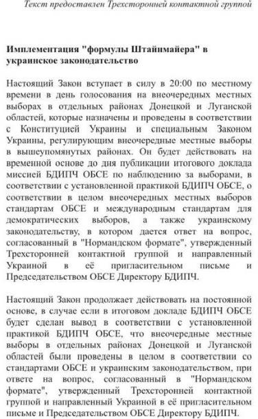 В документе говорится, что закон о "формуле Штайнмайера" вступает в силу в 20:00 в день голосования в ОРДЛО. Эти выборы происходят по специальному закону, который накануне принимает Украина.
