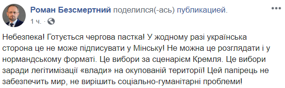 "Опасность! Готовится очередная ловушка! В любом случае украинская сторона это не может подписывать в Минске! Нельзя это рассматривать и в нормандском формате. Это выборы по сценарию Кремля. Это выборы ради легитимизации "власти" на оккупированной территории! Эта бумажка не обеспечит мир, не решит социально-гуманитарные проблемы!", - написал политик.