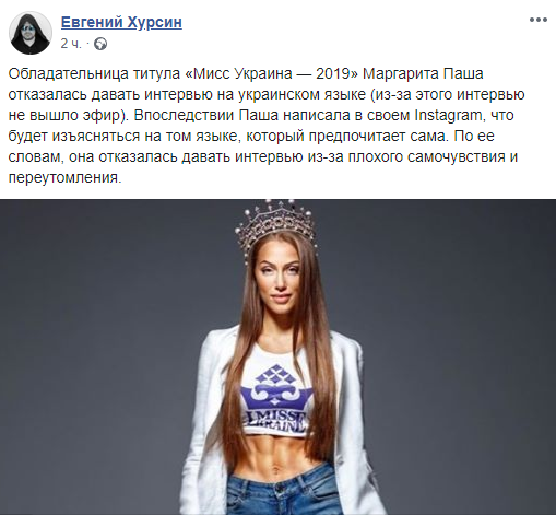 "Обладательница титула "Мисс Украина - 2019" Маргарита Паша отказалась давать интервью на украинском языке (из-за этого интервью не вышло эфир). Впоследствии Паша написала в своем Instagram, что будет изъясняться на том языке, который предпочитает сама. По ее словам, она отказалась давать интервью из-за плохого самочувствия и переутомления" - пишет блогер Евгений Хурсин. В комментариях подписчики интересуются, внесли ли ее на "Миротворец"