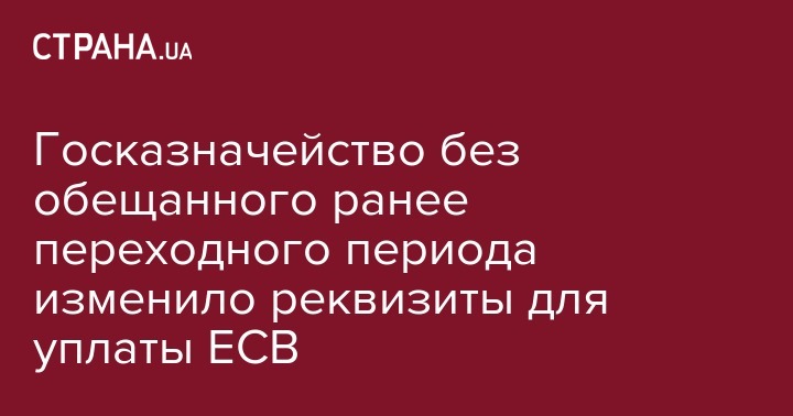 "Главное управление Государственной казначейской службы Украины в Киеве уведомляет, что с 01.10.2019 будут действовать новые счета 3719 для уплаты ЕСВ, открытые на имя Главного управления ГНС в г. Киеве и Офиса крупных налогоплательщиков ГНС по стандарту IBAN код банка ( МФО) 899998 (ЕАП)", - сказано на сайте.