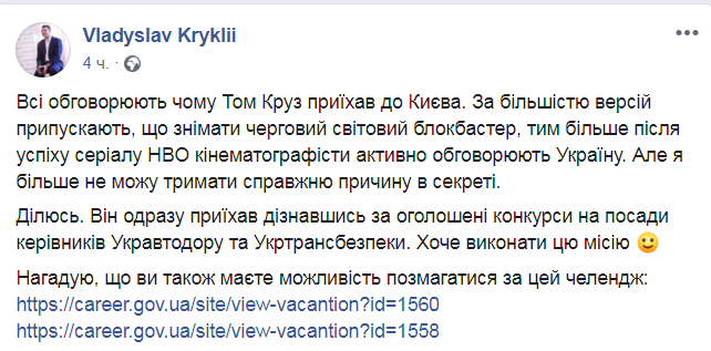 "Все обсуждают, почему Том Круз приехал в Киев. Большинство версий предполагают, что снимать очередной мировой блокбастер, тем более после успеха сериала НBO кинематографисты активно обсуждают Украину. Но я больше не могу держать настоящую причину в секрете. Делюсь. Он сразу приехал, узнав об объявленных конкурсах на должности руководителей "Укравтодора" и "Укртрансбезопасности". Хочет выполнить эту миссию", - написал министр.