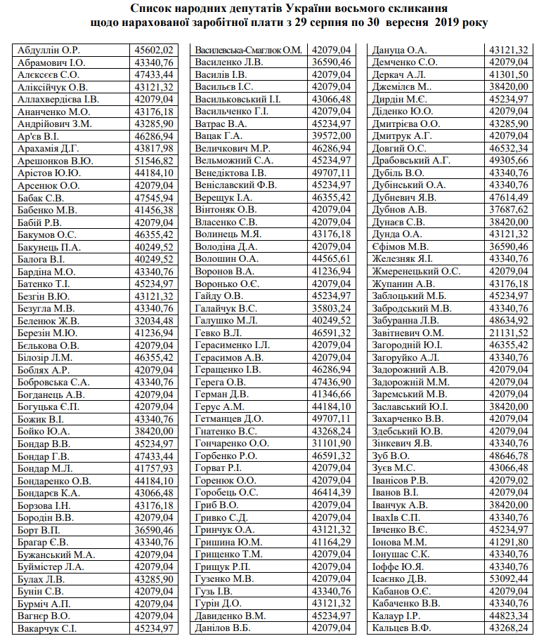 Сообщается, что спикер парламента Дмитрий Разумков за период с 29 августа по 30 сентября получит 50 500 грн, его первый заместитель Руслан Стефанчук – 59 300 грн, а вице-спикер Елена Кондратюк 49 800 грн.