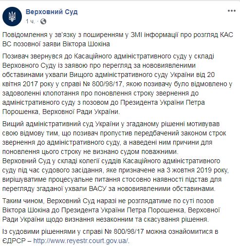 В Верховном суде напомнили, что ВАСУ мотивировал отказ тем, что истец пропустил срок обращения, а причины для возобновления этого срока судом не признаны уважительными. "Верховный суд в составе коллеги судей Кассационного административного суда во время судебного заседания, которое назначено на 3 октября 2019 года, будет решать процессуальный вопрос наличия оснований для пересмотра указанного определения ВАСУ по вновь выявленным обстоятельствам. Таким образом, Верховный суд пока не будет рассматривать по сути иск Виктора Шокина", - пояснили в суде.