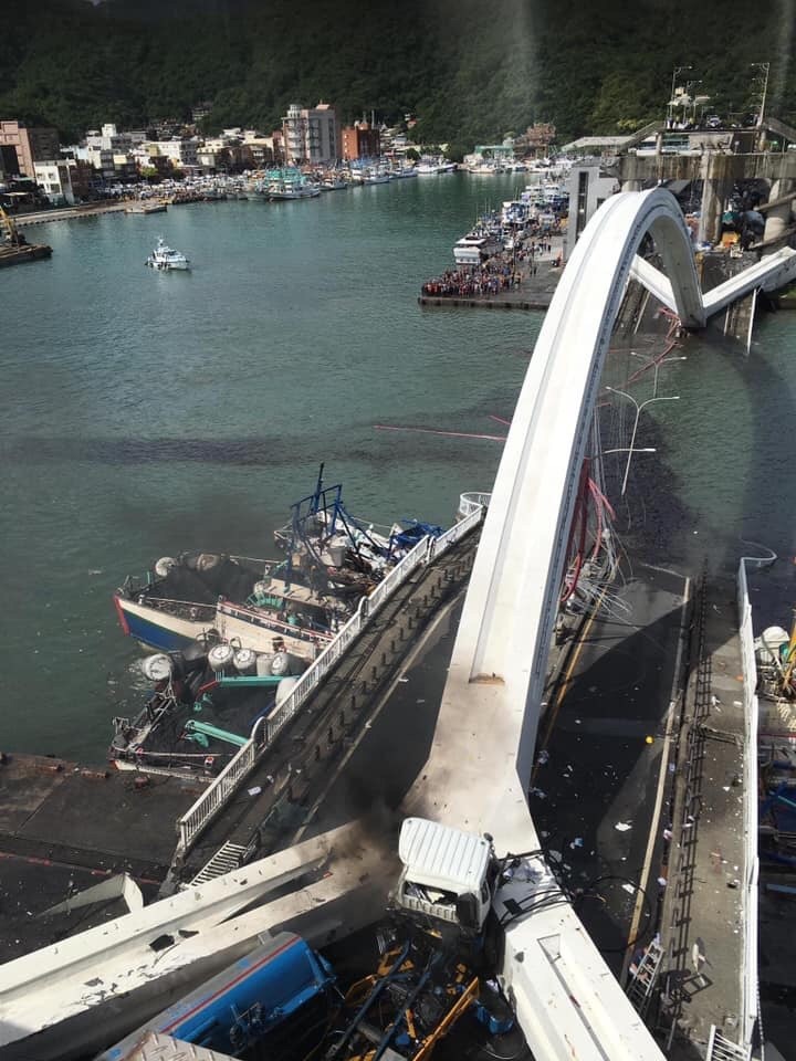 На северо-востоке острова Тайвань рухнул мост в то время, как по нему проезжал бензовоз. Обломки моста упали на находившиеся внизу лодки рыбаков, передает Taiwan news.