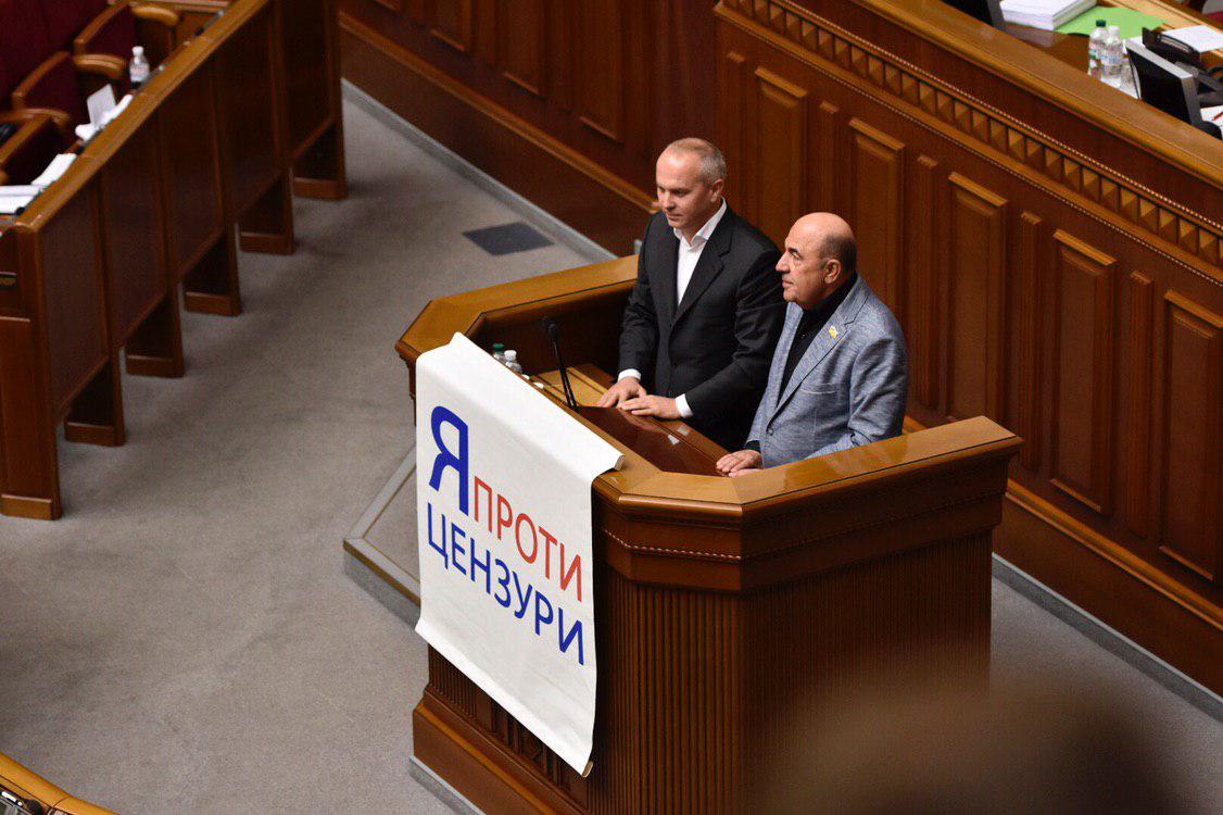 Перед заседанием Верховной Рады в среду, 2 октября, нардепы от "Оппозиционной платформы - За жизнь" Нестор Шуфрич и Вадим Рабинович повесили на трибуну плакат против цензуры.