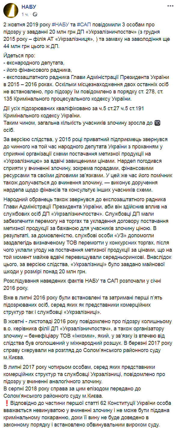 Сотрудники Национального антикоррупционного бюро Украины (НАБУ) и Специализированной антикоррупционной прокуратуры (САП) сообщили о подозрении в нанесении ущерба на сумму более 20 млн грн ГП "Укрзализнычпостач" бывшему народному депутату и еще двум лицам.