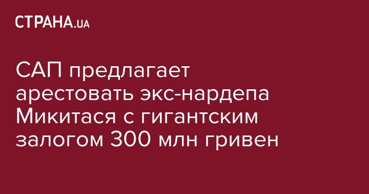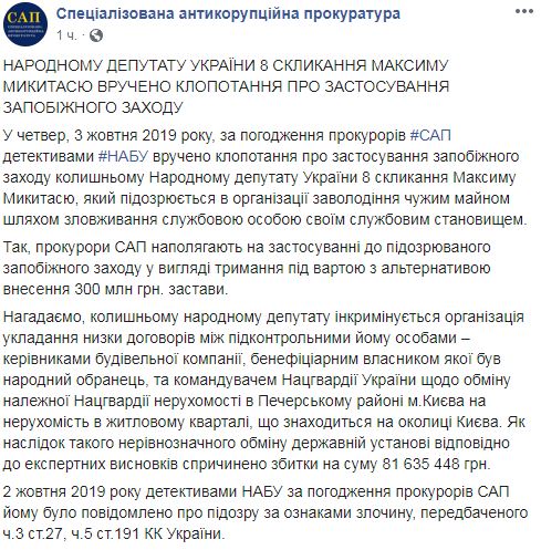 "3 октября ... вручено ходатайство о применении меры пресечения... Максиму Микитасю", - сказано в сообщении. Отмечается, что прокуроры САП настаивают на применении к подозреваемому меры пресечения в виде содержания под стражей с альтернативой внесения 300 миллионов гривен залога. Микитасю сообщили о подозрении в завладении имуществом Нацгвардии на сумму более 81 миллиона гривен.
