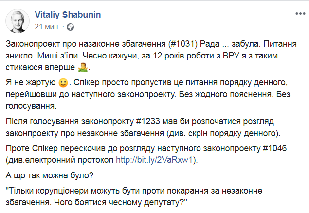 "Я не шучу. Спикер просто пропустил этот вопрос повестки дня, перейдя к следующему законопроекту. Без всякого объяснения. Без голосования... А так можно было? Только коррупционеры могут быть против наказания за незаконное обогащение. Чего бояться честному депутату?" - написал Шабунин.