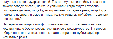 "Средь бела дня, рефрижераторы вывозят контрабандным путем десятки тонн кефали из НПП "Тузловские лиманы", в строго контролируемой погранзоне и тогда, когда в разгаре, на уровне держава Украина, проходят испытания ракетных комплексов Ольха-М и Нептун в Одесской области на государственном испытательном полигоне "Алибей" в Татарбунарском районе (!)" - добавляет эколог.