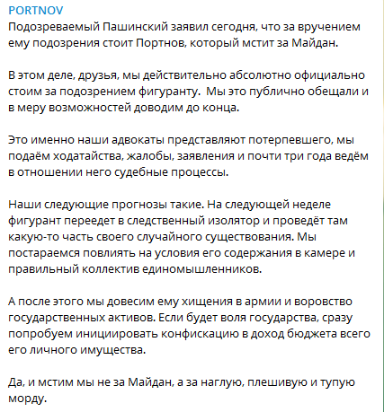 "Мы постараемся повлиять на условия его содержания в камере и правильный коллектив единомышленников. А после этого мы довесим ему хищения в армии и воровство государственных активов. Если будет воля государства, сразу попробуем инициировать конфискацию в доход бюджета всего его личного имущества. Да, и мстим мы не за Майдан, а за наглую, плешивую и тупую морду", - написал Портнов.