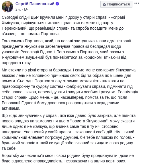"Сегодня следователи ГБР вручили мне подозрение по старому делу – "делу Химикуса", решается вопрос о взятии меня под стражу. Убежден, что реанимация дела и попытка посадить меня в тюрьму – это месть Портнова", - сообщил Пашинский.