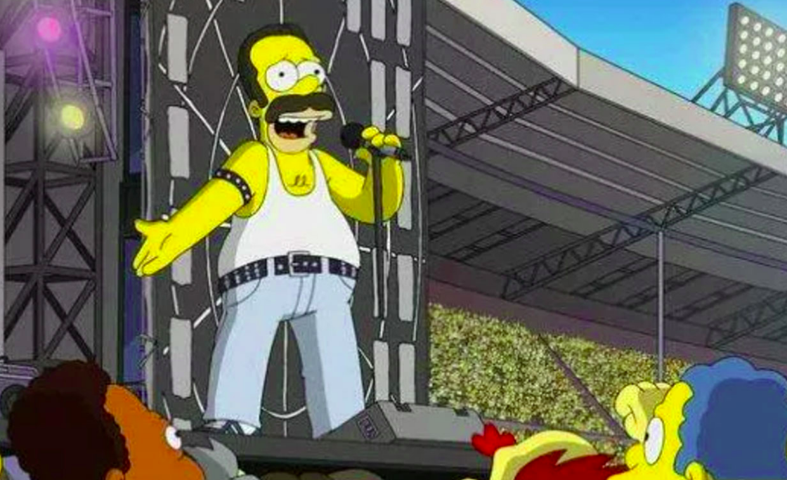 В интернете появился кадр из новой серии "Симпсонов", на котором видно, что главный герой мультсериала в образе ныне покойного лидера группы Queen Фредди Меркьюри выступает на стадионе перед огромной толпой зрителей. Об этом сообщает NME.