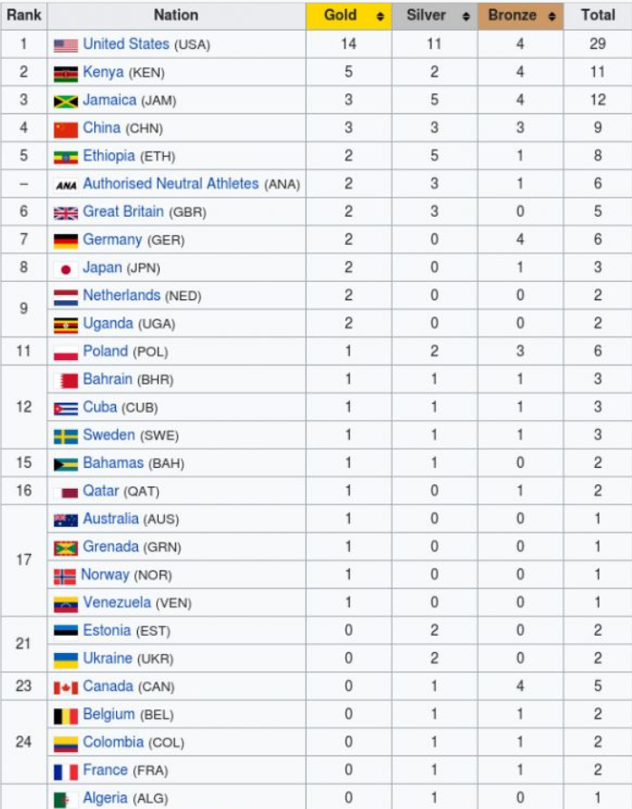 А больше всех наград завоевала сборная США. Причем американцы победили с космическим отрывом от соперников. У них 14 золотых наград, 11 серебряных и 4 бронзовых медали. На втором месте - Кения, а на третьем - Ямайка.