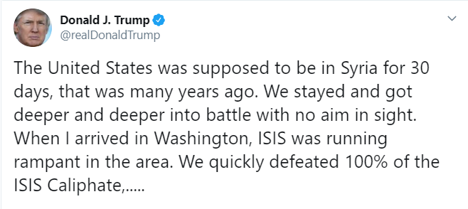 "Курды сражались вместе с нами, но им выплачивались огромные деньги и предоставлялась техника для этого. Они воевали с Турцией в течением десятилетий... пришло время нам выйти из этих смехотворных бесконечных войн, многие из них ведутся между племенами, и вернуть наших солдат домой", - написал Трамп в Twitter.