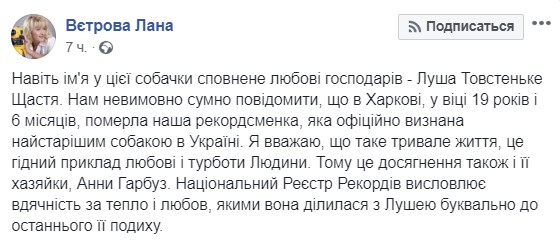 "Даже имя у этой собачки исполнено любви хозяев – Луша Толстенькое Счастье... Я считаю, что такая долгая жизнь – это достойный пример любви и заботы человека. Поэтому это достижение также и ее хозяйки, Анны Гарбуз. Национальный реестр рекордов выражает благодарность за тепло и любовь, которыми она делилась с Лушей буквально до последнего ее вздоха", – написала Ветрова.