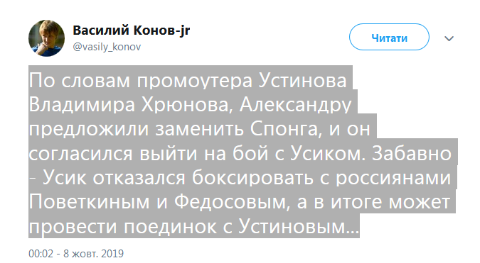 "По словам промоутера Устинова Владимира Хрюнова, Александру предложили заменить Спонга, и он согласился выйти на бой с Усиком. Забавно - Усик отказался боксировать с россиянами Поветкиным и Федосовым, а в итоге может провести поединок с Устиновым...", - написал Василий Конов.