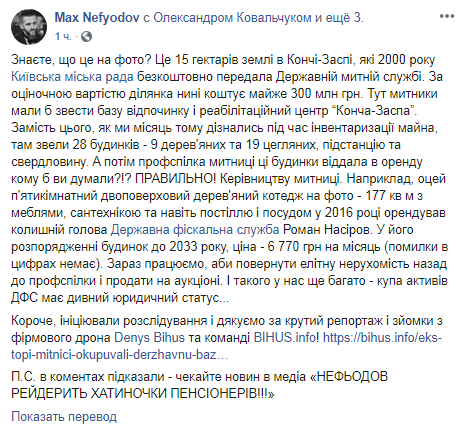 "Тут таможенники должны были построить базу отдыха и реабилитационный центр "Конча-Заспа". Вместо этого, как мы узнали месяц назад в ходе инвентаризации имущества, там построили 28 домов – девять деревянных и 19 кирпичных, подстанцию и скважину. А потом профсоюз таможни эти дома отдал в аренду - кому б вы думали?!? Правильно! Руководству таможни", – написал Максим Нефедов.