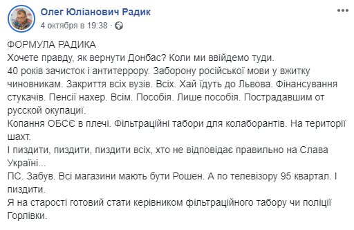 Я на старости готов стать руководителем фильтрационного лагеря или полиции Горловки" - написал Радык в Facebook.