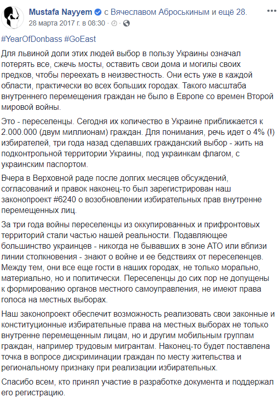 "Наш законопроект обеспечит возможность реализовать свои законные и конституционные избирательные права на местных выборах не только внутренне перемещенным лицам, но и другим мобильным группам граждан, например трудовым мигрантам. Наконец-то будет поставлена точка в вопросе дискриминации граждан по месту жительства и региональному признаку при реализации избирательных", - сообщал Найем в марте 2017 года.