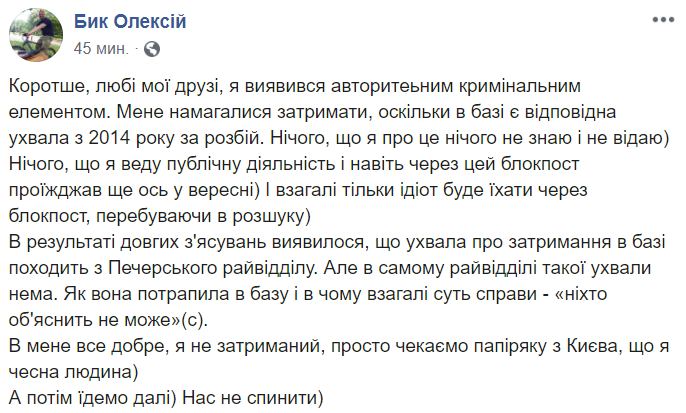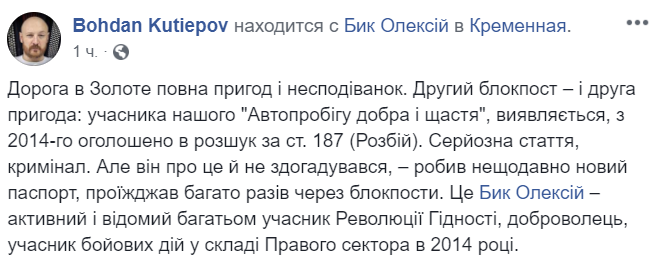 "...участник нашего "Автопробега добра и счастья", оказывается, с 2014-го объявлен в розыск по ст. 187 (Разбой). Серьезная статья, криминал. Но он об этом и не догадывался, – делал недавно новый паспорт, проезжал много раз через блокпосты. Это Бык Алексей – активный и известный многим участник Революции Достоинства, доброволец, участник боевых действий в составе Правого сектора в 2014 году", - написал Кутепов.