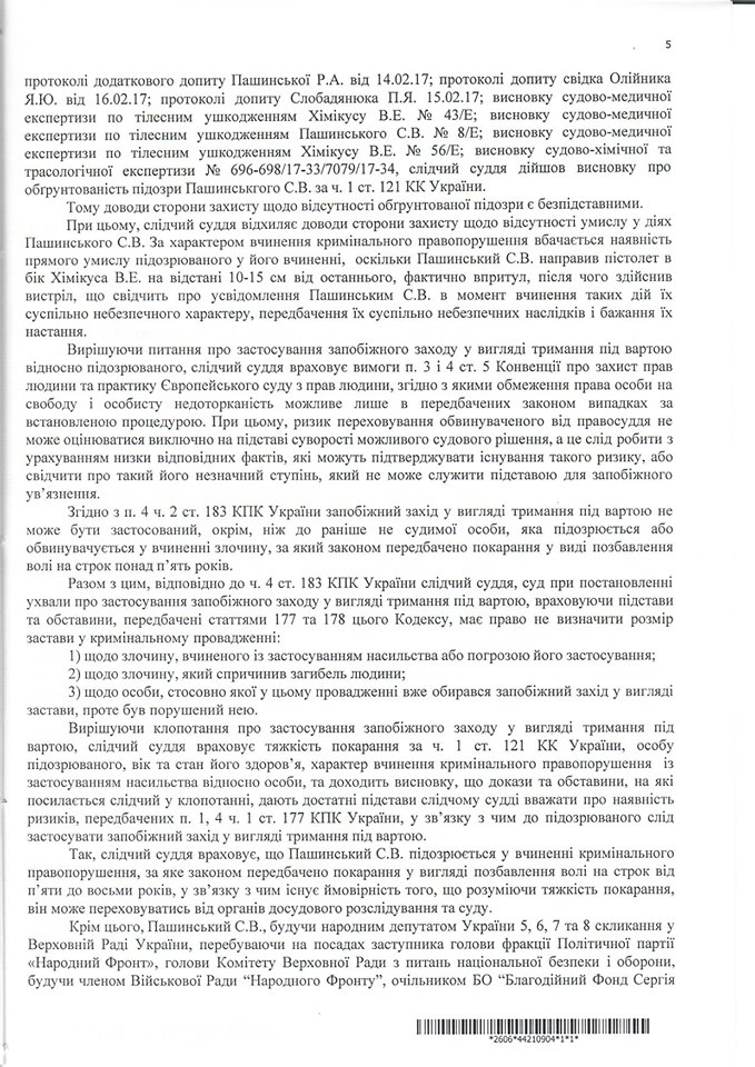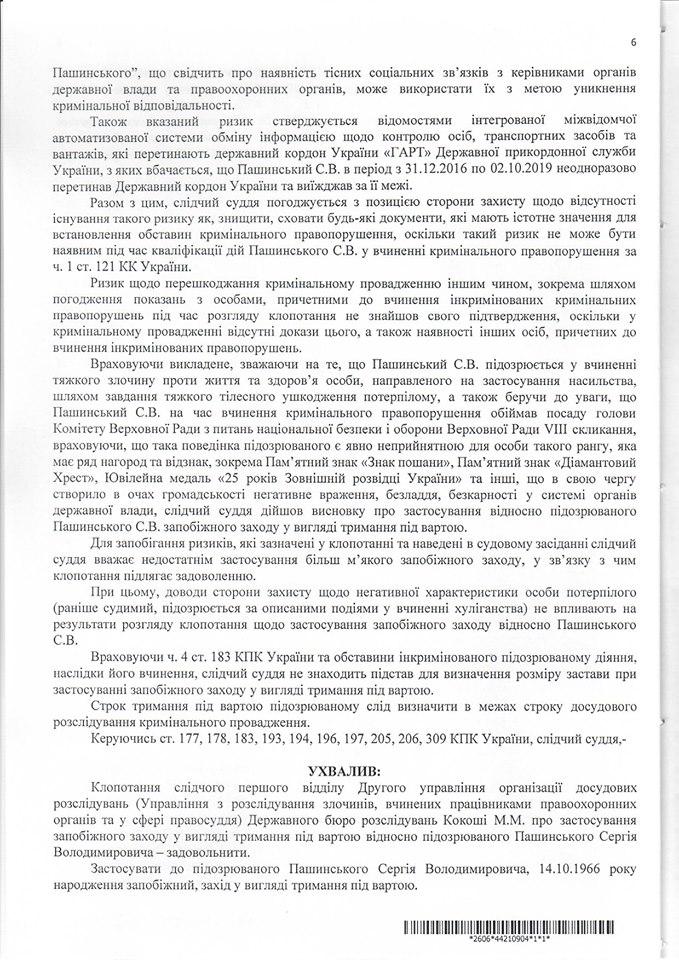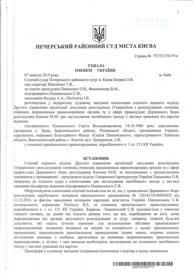 Адвокат экс-нардепа Сергея Пашинского Андрей Федур обнародовал полное решение суда о назначении его подзащитному меры пресечения в виде заключения под стражу.
