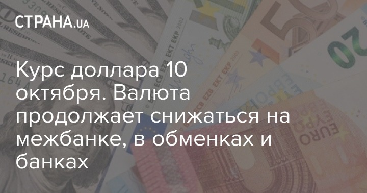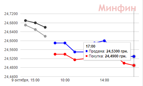 10 октября курс доллара в обменках снизился на 15-16 копеек за день: валюту покупают за 24,72 грн, продают за 24,80 грн. Межбанк закрылся снижением на 13 копеек: покупка - 24,49 грн и продажа - 24,53 грн. В банках вечером доллар покупают от 24,10 до 24,75 грн, продают - от 24,60 до 25,40 грн.