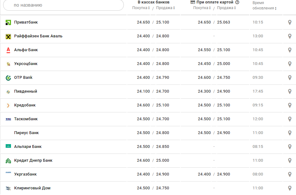 В банках курс доллара с утра был такой: покупка от 24,30 до 24,86 грн, продажа - от 24,80 до 25,60 грн.
