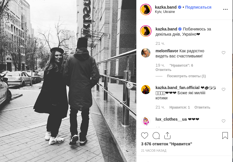Так, на странице коллектива KAZKA в Instagram появилось несколько черно-белых фото, на которых Зарицкая и Будаш гуляют по Киеву и на одном снимке Александра приобнимает Никиту сзади.