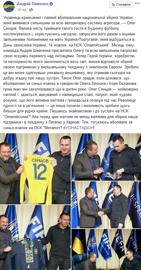 "Украинец-крымчанин и горячий болельщик сборной Украины, который оказался сильнее всей авторитарной системы агрессора, - Олег Сенцов. Большая честь принимать такого гостя в Доме футбола, общаться и, пользуясь случаем, пригласить его вместе с другими освобожденными пленными на матч Украина-Португалия, который состоится в День защитника Украины, 14 октября, на НСК "Олимпийский".