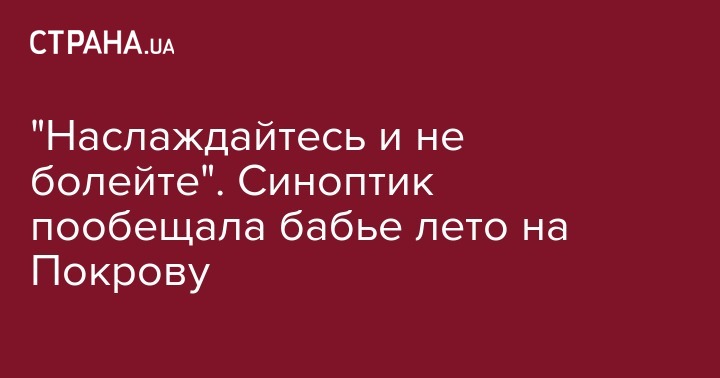 "На выходных температура воздуха снова поднимется вверх и будет радовать всех теплом и солнышком. Уже в субботу-воскресенье ожидается +16...+23 градуса. На Покрову погода в Украине ожидается просто роскошной - солнечно, ясно, +20...+25 градусов. Кто там хотел бабьего лета - ловите, наслаждайтесь и не болейте. Ведь впереди много совместной осенней работы и удовольствие от созерцания красивого октября", - написала Наталья Диденко.