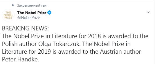 Напомним, что нобелевскую премию по литературе вручат сразу за 2018 и 2019 годы. Особенностью нынешней Нобелевской недели будет то, что известны имена сразу двух лауреатов. Нобеевским лауреатом за 2019 год стал австрийский писатель Петер Хандке.