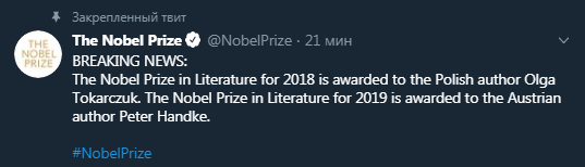 В четверг, 10 октября, был объявлен лауреат Нобелевской премии по литературе в 2019 году. Об этом сообщает пресс-служба Нобелевского комитета в Twitter.